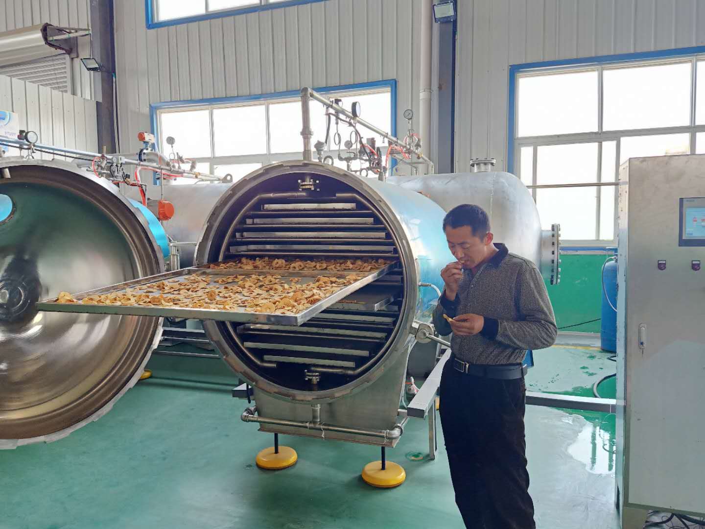 果蔬脆片真空膨化加工設備由加熱、加壓、真空負壓膨化、抽濕、脫水、冷卻一體化設計,在真空下連續性完成,產品非油炸酥脆可口,產品處于負壓狀態,在這種相對缺氧的條件下進行食品加工,可以減輕甚至避免氧化作用(例如脂肪酸敗、酶促褐變和其他氧化變質等)所帶來的危害。
